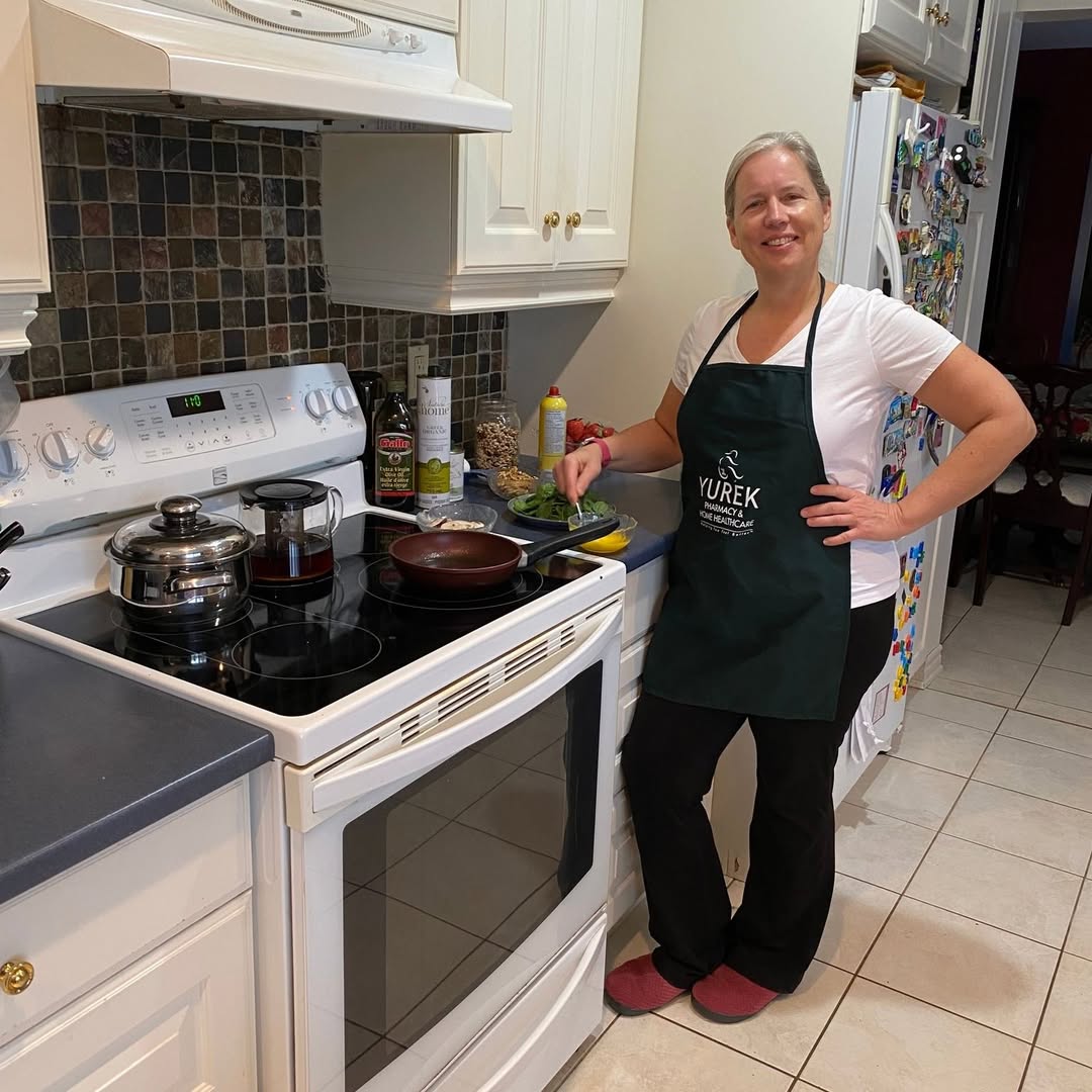 Diane standing in her kitchen, with pots and pans on the stove.
